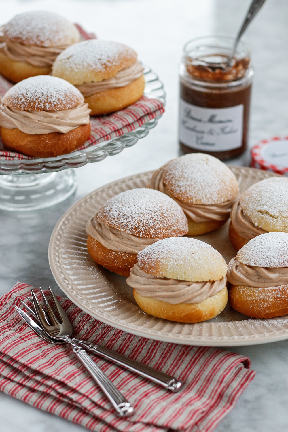 Za kremo zavremo 250 ml mleka. 50 ml mleka zmešamo s praškom za puding in vmešamo v vroče mleko, da dobimo lep, kremast puding. Liste želatine namočimo v hladno vodo, jih ožamemo in raztopimo v vročem pudingu. Dobro premešaj. Puding vlijemo v skledo, v puding vmešamo Bonne Maman lešnikov namazs s kakavom. Puding dobro pokrijemo s folijo in pustimo v hladilniku, da se strdi in popolnoma ohladi. Stepeno smetano stepemo do trdega in jo nežno vmešamo v puding. Kremo nalijte v cevno vrečko z velikim zvezdastim nastavkom in jo nanesite na krofe. Pokrijte in potresite s sladkorjem v prahu. Do serviranja ohladite.