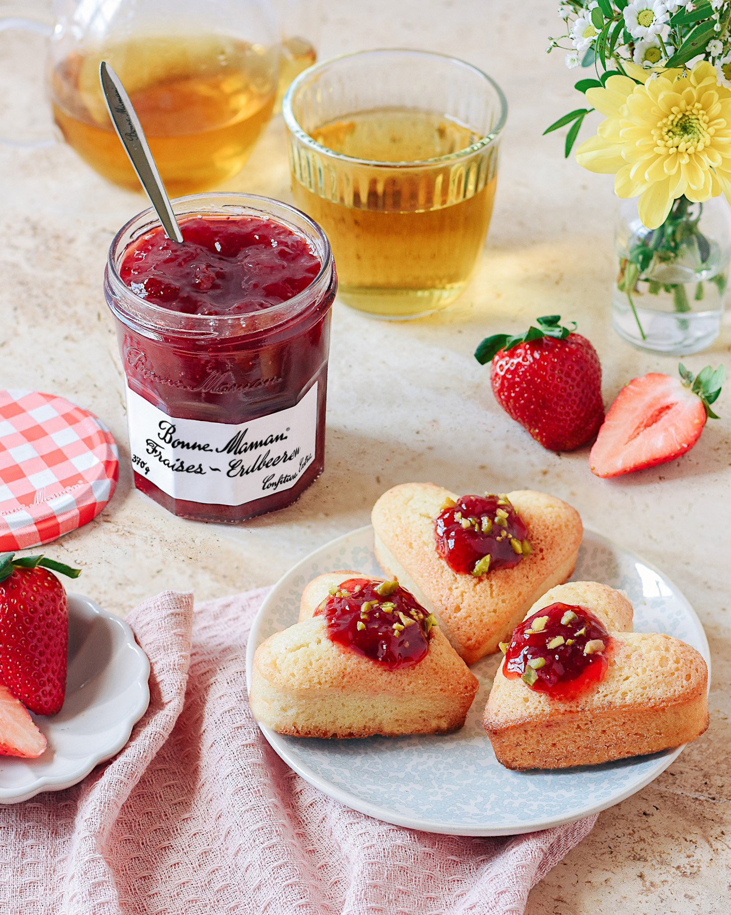 Ko so keksi pečeni in ohlajeni, na vrhu z nožem izdolbite luknjo in izdatno napolnite z jagodnim džemom Bonne Maman. Okrasite z nekaj pistacij.